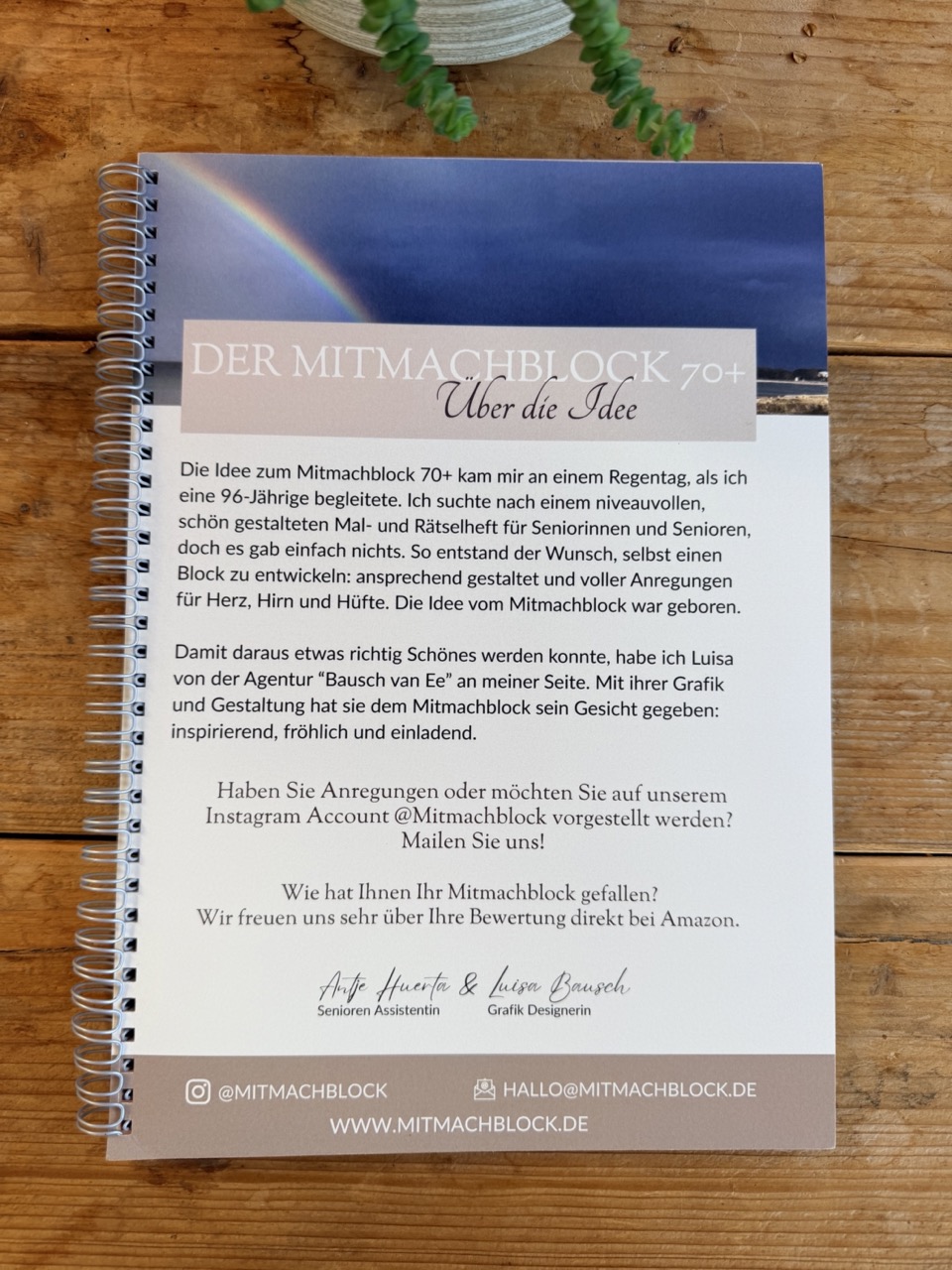Ich habe den Mitmachblock für meine Mutter (84) bestellt, sie ist begeistert!Die Aufgaben sind gut zu machen und das Ganze ist richtig liebevoll gestaltet. Sie freut sich jetzt schon auf die Frühjahrs Ausgabe. Danke!